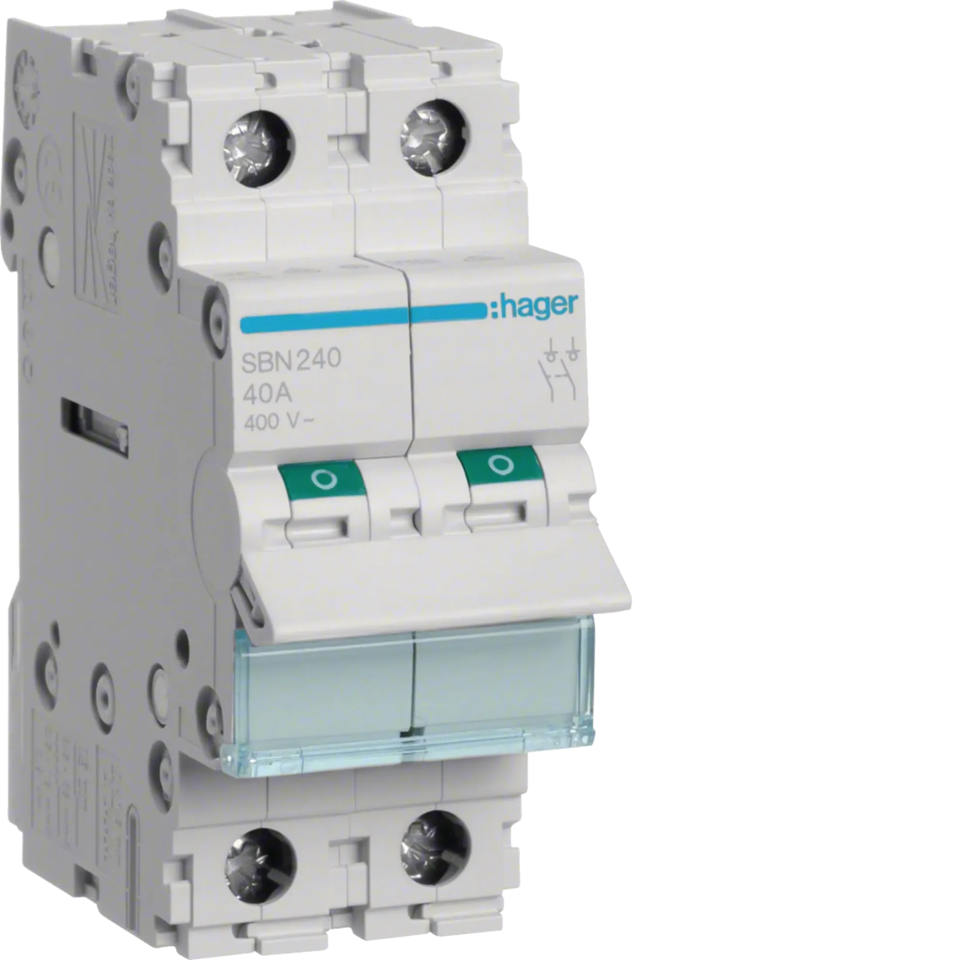Hager SBN240, iki kutuplu (2P) ve 40 A akım değerine sahip, modüler yapılı bir switch-disconnector/izolatör ürünüdür. 400 V AC nominal işletme gerilimine uygun olup, izolasyon (switch) ve devre kesme (disconnector) işlevlerini bir arada sunar. Cihazın yalıtım gerilimi Ui ≈ 440 V, darbeye dayanıklılığı (impulse withstand voltage) Uimp ≈ 6.000 V’dir. IP20 koruma sınıfına sahiptir; sadece iç ortamlarda, su sıçraması olmayan yerlerde kullanılmalıdır. Modül genişliği 2’dir, DIN ray montajına uygundur. Bağlantı terminalleri vida tipi olup esnek iletkenlerde 2,5-16 mm², rijit iletkenlerde 2,5-25 mm² arasında olan iletken kesitlerini destekler. Boyutları yaklaşık 83 mm yükseklik × 35 mm genişlik × 68 mm derinliktir. Mekanik ömrü 60.000 açma-kapama çevrimine kadardır; elektriksel ömrü normal yük altında AC21 ve AC22 kategorilerinde yaklaşık 5.000 işletim çevrimidir. Çalışma sıcaklığı -20 °C ile +70 °C arasıdır; taşınma / depolama koşulları ise -40 °C ile +80 °C aralığını kapsar.