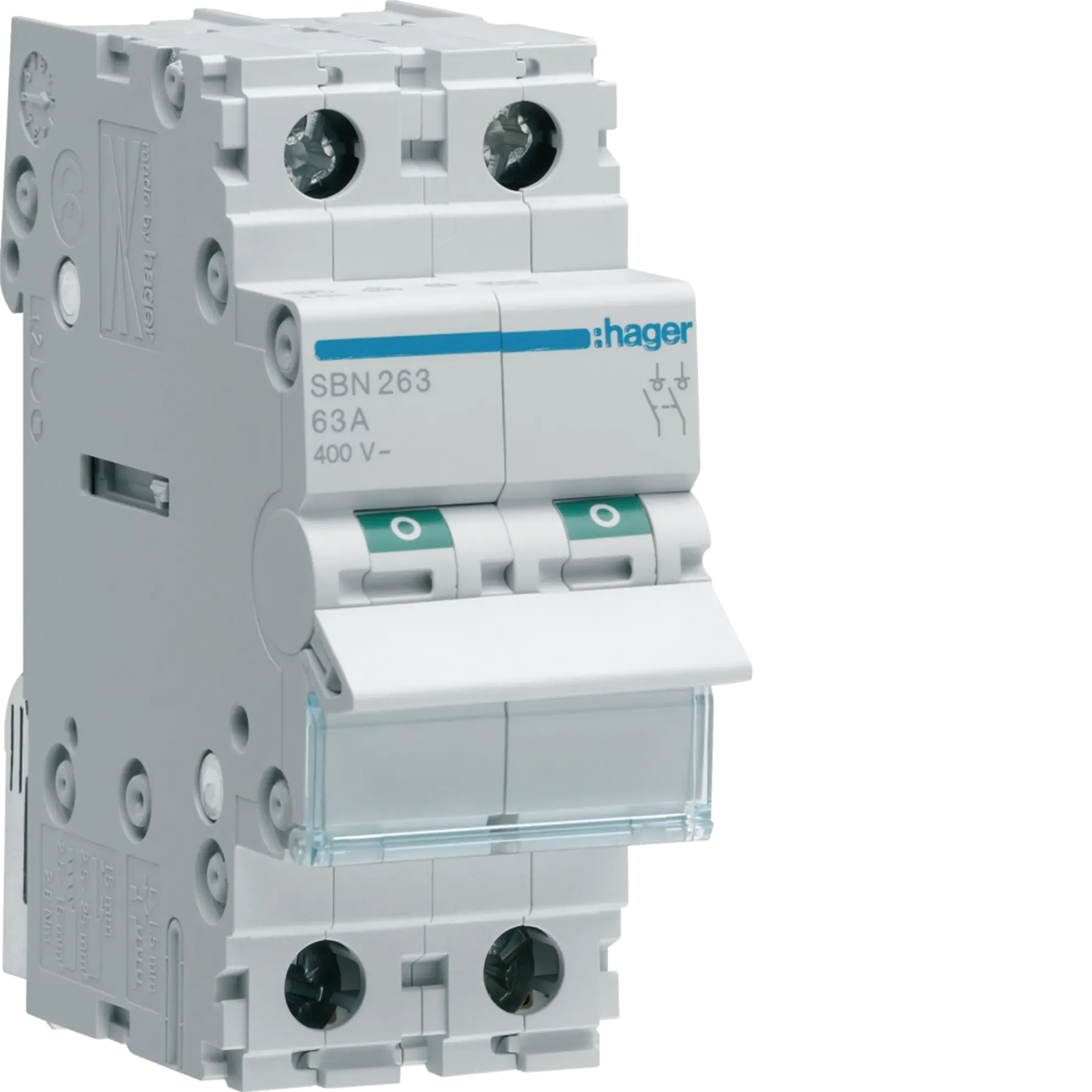 Hager SBN263, iki kutuplu (2P) ve 63 A nominal akım değerine sahip bir switch-disconnector/izolatör ürünüdür. 400 V AC nominal işletme voltajı olan şebekelerde güvenli devre kesme ve izolasyon sağlar. Yalıtım gerilimi Ui ≈ 440 V’dur ve darbe dayanımı (Uimp) yaklaşık 6000 V seviyesindedir. Ürün, IP20 koruma sınıfına sahiptir; iç mekan uygulamaları için ideal olup, suya karşı koruma sağlamaz. Modüler yapıdadır – cihazın modül genişliği 2 modüldür ve DIN raylı panolara monte edilir.