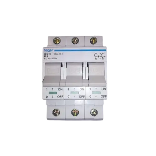 Hager SB340, 3 kutuplu ve 40A nominal akım kapasiteli modüler izolatör anahtardır. Elektrik devrelerinin güvenli bir şekilde izole edilmesini sağlar ve bakım/onarım sırasında yüksek emniyet sunar. Sağlam yapısı ve kolay montaj özellikleriyle elektrik panolarında uzun ömürlü kullanım için uygundur.