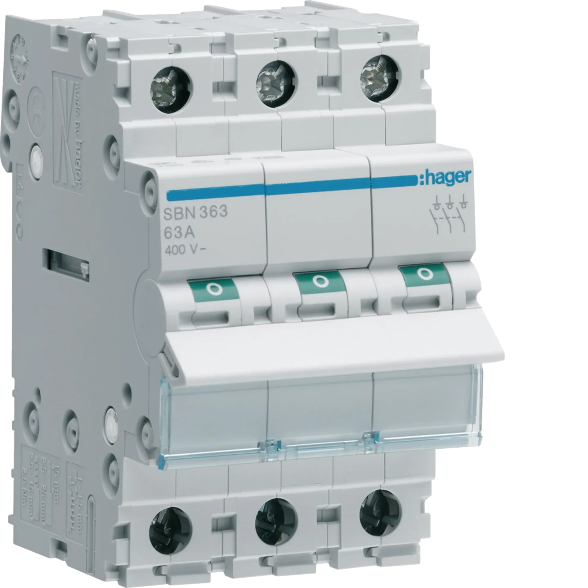 Hager SBN363, üç kutuplu (3P), 63 A nominal akıma sahip modüler switch‑disconnector/izolatör cihazıdır. 400 V AC nominal işletme voltajı ile çalışır ve nötr kutbu içermez. Ürün, 3 modül genişliğinde olup DIN ray montajına uygundur. Yalıtım gerilimi (Ui) 440 V, darbe dayanıklılığı (Uimp) 6.000 V’dur ve IP20 koruma sınıfına sahiptir; iç mekân uygulamaları için uygundur. Bağlantı terminalleri vida tipi olup, esnek iletkenler için 2,5‑16 mm², rijit iletkenler için 2,5‑25 mm² kesit aralığını destekler. Mekanik ömrü yaklaşık 60.000 açma‑kapama çevrimine sahiptir; elektriksel ömrü ise AC21 ve AC22 kullanım kategorilerinde nominal yük altında yaklaşık 5.000 işletim çevrimidir. Boyutları yaklaşık 83 mm yükseklik × 52,5 mm genişlik × 68 mm derinliktir. Çalışma sıcaklığı ‑20 °C ile +70 °C arasında, depolama/taşıma koşulları ise ‑40 °C ile +80 °C arasıdır.